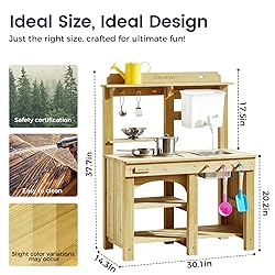 Outdoor Mud Kitchen – Sturdier & More Fun! Let your little chefs explore endless outdoor adventures with our upgraded mud kitchen! Designed with a spacious worktop and double-layered large storage space for all the accessories. Water play zone, cooking station, and sensory exploration area, kids can explore various play scenarios, stimulating sensory development. Smart Modular Design – Cook, Create & Explore! With a flexible layout, the stovetop easily converts into a sensory play table. Kids can cook up imaginative meals, then switch to muddy play, water fun, or planting flowers—all in one compact station. A perfect blend of role play and hands-on nature exploration that encourages creativity, fine motor skills, and endless outdoor adventures. Interactive Water Play – Real Sink for Real Fun! The mud kitchen integrated water tank, sink, and faucet, designed to create an exciting water play experience. With a 4L water tank, kids can wash veggies, play with water toys, clean muddy hands, or create their own splash zone. Perfect for summer days—just add water, and let the fun flow! Upgraded Design – Built to Withstand Outdoor Play! Crafted from 12mm thick, sustainably sourced wood and treated with ACQ, this mud kitchen is designed to endure all seasons. 5-strip spliced panel reduces warping and cracking, enhanced sanding processes minimize rough edges and splinters, providing a safer and more enjoyable play experience for little hands. Effortlessly Clean - Always Ready for Fun! This outdoor mud kitchen comes with everything your child needs for realistic play! Ideal for gardens, backyards, and outdoor play areas. The surface is easy to clean with a water gun, keeping the kitchen neat and ready for endless fun. Friendly Tips: We use ACQ treatment technology to enhance the durability of the wood in an eco-friendly way. If there are green water pattern marks on the product, this is the color of the solution and it is a normal phenomenon. Please don't worry. When the outdoor kitchen is exposed to sunlight in the backyard for a certain period of time, the green color will gradually fade. Warm Care Tip – For Long-Lasting Outdoor Fun To keep your outdoor kitchen looking its best, we recommend gentle cleaning with a damp cloth. Re-staining once or twice a year helps protect against drying and cracking. When not in use, store it indoors or cover it with a waterproof cover to shield it from rain and snow. PLEASE NOTE: When filled with water, the sink becomes quite heavy. For safety, always have an adult move or lift the sink.