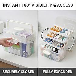 [INSTANT ACCESS & VISIBILITY] No more digging through messy drawers! The clear transparent lid lets you spot supplies instantly. Our innovative 180° expansion cantilever trays automatically display all 3 layers at once, making it easy to grab band-aids or pills in an emergency [SMART VERTICAL STORAGE] Designed for efficiency. The deep bottom compartment is optimized to hold standard medicine bottles and disinfectant sprays upright, while the upper partitioned trays are perfect for sorting small items like thermometers, ointments, and cotton swabs. (Note: Please check the size image before purchase to ensure it fits your specific needs.) [SECURE SNAP-LOCK DESIGN] Features a robust rotary safety latch that keeps the lid tightly closed, protecting your essentials from dust and moisture while preventing accidental spills. The ergonomic handle makes it a reliable travel-ready first aid kit for road trips, camping, or college dorms [VERSATILE ORGANIZER BIN] A true multi-purpose organizer! While perfect as a family pharmacy, its compact footprint makes it ideal as a sewing box, craft organizer for beads/washi tapes, or cosmetic storage. Keep your desktop clutter-free without taking up too much counter space [COMPLETE HEALTH MANAGEMENT SET] Great value bundle includes 2x Portable Pocket Pill Cases (for purse or travel) and 70x Pre-printed & Blank Labels. An essential home organization gift for new homeowners, parents, and students