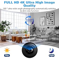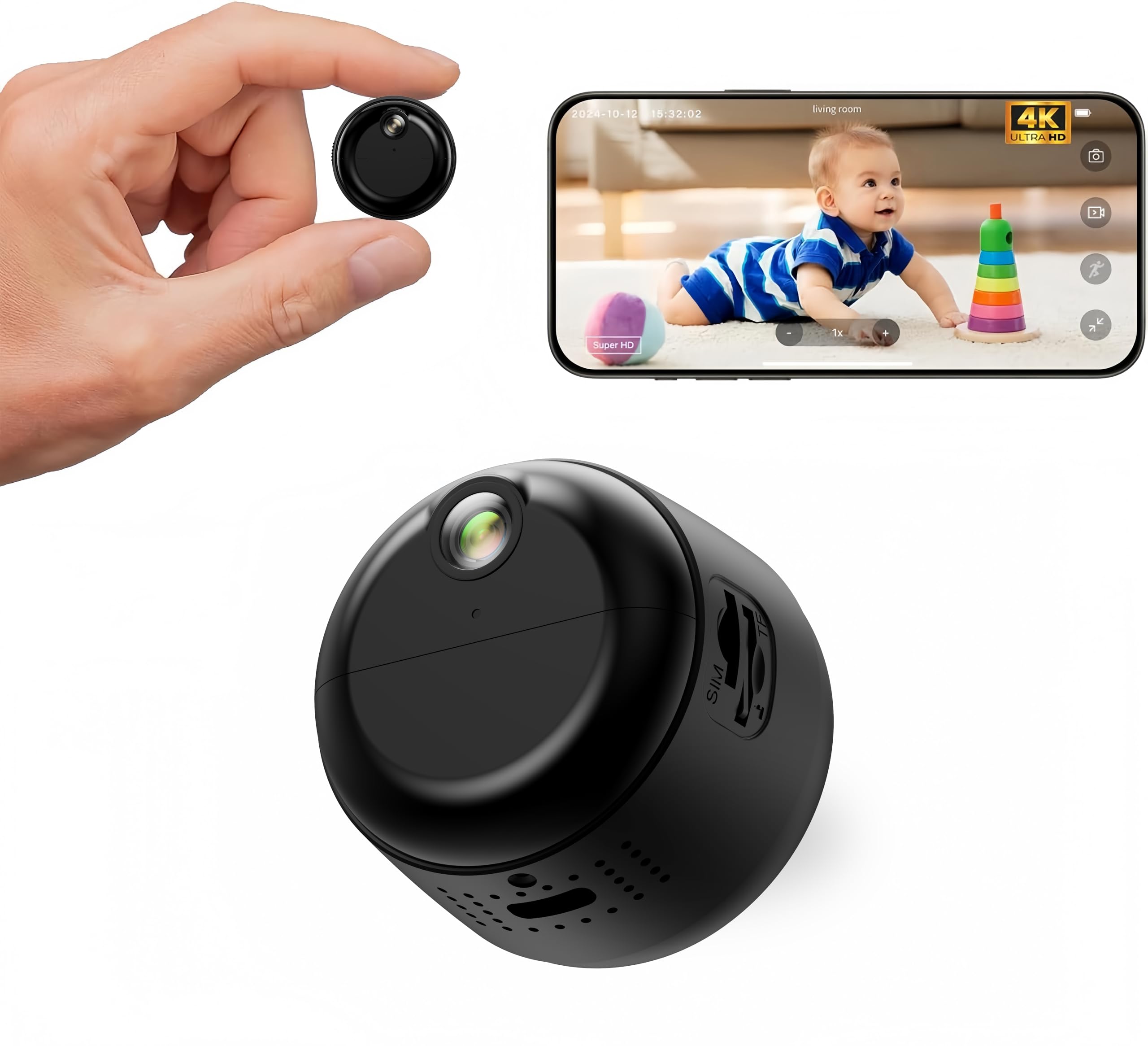 4K Full video resolution. This small camera is equipped with a special optical glass lens, and the screen is bright and clear. It is a real Full HD 4K. Supports up to 128GB microSD cards, and if the capacity is full, overwrite the recording and save it!(no audio) Perfect for monitoring entryways, backyards, warehouses, or retail stores. Ideal use cases include theft prevention, package delivery tracking, and pet activity observation (without audio intrusion). Advanced Motion Detection: Get instant alerts on your phone when movement is detected, keeping you informed. Super Small & Discreet: Easily hides anywhere thanks to its ultra-compact, space-saving design. Versatile Placement: Perfect for monitoring your home, nursery, office, or any room indoors.