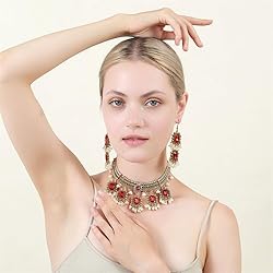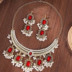 ELEGANT DESIGN: Vintage-inspired Indian traditional jewelry set featuring cz rectangle pearl beaded elements and decorative tassels for a stunning ethnic look SET INCLUDES: Complete set with choker necklace and matching dangle drop stud earrings, perfect for creating a coordinated look NECKLACE LENGTH: 16.5 inches choker necklace with antique finish, ideal for most neck sizes and outfit combinations VERSATILE WEAR: Perfect for wedding ceremonies, traditional celebrations, formal parties, and special occasions requiring elegant ethnic accessories FASHION STATEMENT: Bollywood-inspired design combines classic Indian elements with contemporary styling for a unique and sophisticated appearance