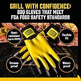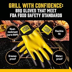 【SUPERIOR HEAT PROTECTION (UP TO 500°F)】 – Keep your hands safe while flipping, basting, and searing—these heat resistant bbq gloves are built to handle the intense heat of real BBQ action, protecting you up to 500°F. 【WATERPROOF & EASY TO CLEAN】 – No more greasy, stained BBQ gloves. The waterproof exterior wipes clean in seconds or can be rinsed off under the sink—ready for your next cookout. 【FLEXIBLE FIT FOR TRUE PITMASTER CONTROL】 – Designed for comfort and dexterity, these grilling gloves give you full control—no more bulky mitts. Grip tongs, utensils, and meat with confidence. 【MADE WITH FDA FOOD-SAFE MATERIALS】 – Grill with peace of mind. These heat resistant grilling gloves are crafted with food-safe materials, ensuring safe handling of everything from brisket to ribs straight off the grill. 【BUILT FOR BBQ LOVERS, BY BBQ LOVERS】 – Say goodbye to one-size-fits-all frustration. Designed by the pros at Hey Grill Hey, for backyard pitmasters who take their grilling seriously, these BBQ gloves offer a perfect fit from size Small to XXL.