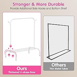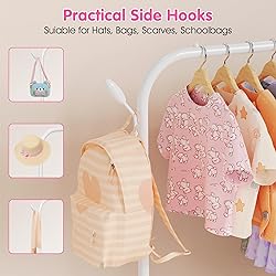【Cultivate Good Habits】This kids clothes rack is perfect for kids aged 3-6, this child-sized clothing rack makes it easy for little ones to reach and manage their own clothes. It encourages independence by helping them develop tidy-up habits while saving space in small rooms. Holds plenty of outfits even winter coats without clutter! 【Sturdy & Safe Design 】The toddler clothes hanging rack features with heavy-duty U-shaped metal base provides strong support, holding up to 20-30 hangers (even packed with princess dresses!). Unlike flimsy racks, our small clothing rack stays firmly in place, preventing tipping for worry-free use. 【Extra Storage Shelf & Hooks】Features a bottom shelf for shoes, toys, or storage bins—plus two side hooks for bags and hats! The anti-slip stoppers keep hangers from sliding off, making organization a breeze. This short dress up rack will be a practical kids closet and a wonderful decorative rack. 【Easy to Assemble & Portable】Our toddler wardrobe rack is easy to assemble. It can be assembled within 5 minutes with the included instruction by one person. You can easily move to your playroom, toddlers bedroom, laundry room or nursery. 【Mulit-Scene Use】Children's clothing rack is perfect for playroom, toddlers bedroom, laundry room, nursery and meanwhile doesn't take up much space. Ideal gift choice for Birthday Day, Baby Shower and Christmas!