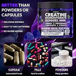 HIGHLY ABSORBED CREATINE COMPLEX FOR POWERFUL BOOSTS: Experience the ultimate muscle building support with AEQNJV Creatine Monohydrate Gummies Complex, featuring a powerful 9,000 mg of creatine per serving. This advanced formula is fortified with L-Taurine and Vitamin B12 to ensure optimal energy, strength, and endurance. These gummies are designed to help you reach your peak performance, whether you're lifting, running, or recovering. COMPLEX FORMULA, BOOST EFFECTS: AEQNJV Creatine Gummies are packed with creatine, L-taurine, L-Carnitine, BCAA, vitamins B12 and B6. This potent combination not only enhances creatine absorption but also boosts strength and accelerates recovery. It also relieves muscle soreness, promotes rapid muscle growth, and improves endurance. It lets you work harder, recover faster, and build muscle like never before, far better than other creatine. It's the all-around sports energy ! ALL NATURAL BLUEBERRY FLAVOR: AEQNJV Chewables Creatine Monohydrate Gummies are vegan, non-GMO, halal, and gluten-free to suit your dietary preferences. Containing no artificial colors or flavors, these pure and healthy gummies will help you achieve your fitness goals without compromising your principles. Fuel your body with ingredients you can trust. 30 DAYS SUPPLY & HIGHLY EFFECTIVE: AEQNJV Creatine gummies for Men and Women, 30 Days of Powerful Support—4 Gummies per Serving, 120 Gummies Total, Keep You Fueled All Month Long. Designed for low-sugar lovers and fitness enthusiasts, Creatine Pre-Workout Chewables are no mixing, no handling, just a second to enjoy, and a burst of power. Throw it in your bag: burn fat before exercise, rejuvenate after a sweat—your fitness partner anytime, anywhere. QUALITY ASSURANCE, EXCELLENT SERVICE: AEQNJV Creatine gummy in a cGMP-certified facility, our gummies meet the highest standards of manufacturing, ensuring each batch is thoroughly tested for quality and stability. We take pride in delivering a product that supports your goals with reliability and effectiveness. Join thousands of satisfied customers who have experienced the benefits of our premium creatine gummies.