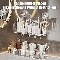 - 2PC Punch-free Suction Cup Bathroom Rack Bathroom When washing up in the morning, the large shower caddy can stably hold facial cleanser and fragrance bottles, while the small no-drill wall caddy can store toothbrushes and razors. The transparent design allows bottles to be seen at a glance, and the hollow bottom can quickly drain water, saying goodbye to the trouble of water accumulation, and the bathroom is instantly tidy and orderly. Kitchen Seasoning bottles and detergents are neatly arranged on the large suction cup storage rack, and the small clear shower shelves can easily store chopsticks and spoons. The punch-free design does not damage the tiles, and it can be cleaned with a single wipe, and the kitchen countertop will say goodbye to clutter from now on. Office The large shower dispenser soap organizer is transformed into a stationery storage box, and sticky notes and pen holders are put in place in an orderly manner; the small shower suction cup shelf basket is used to place paper clips and erasers, and the desktop is instantly refreshed. The transparent material makes the items clearly visible and doubles the work efficiency. 3 Step Quick Installation ① Wipe the wall with a cleaning cloth; ② Tear off the traceless film and stick the suction cup; ③ Tighten to the right to fix; Specifications: Size: small(9.3x9.3x9.5cm/3.6x3.6x3.7in); large(30x10.8x10cm/11.8x4.3x3.9in) Material: plastic Color: clear Style: modern Package Includes: 2 x shower caddy Tips: Applicable Surface: only non-porous, impermeable, smooth surfaces (such as glass, tiles, metal, etc.), not suitable for uneven tiles, wallpaper, painted walls. Load Limit: Please avoid overloading or violent shaking to avoid affecting the adsorption effect. Preparation Before Installation: Make sure the wall is clean, dry, and oil-free to ensure the adsorption of the suction cup. Let this 2pc bathroom storage shelf become your home storage assistant and easily create a neat and orderly living space!: