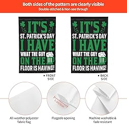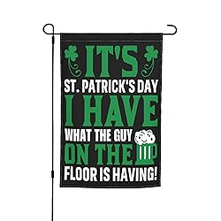 DOUBLE-SIDED PRINTING - It S St Patrick S Day I Have What The Guy On The Mp Floor Is Having Garden Flags Are Designed To Be Double-Sided So That The Design Can Be Viewed From Both Sides And The Text Can Be Read Correctly From Both Sides. QUALITY MATERIAL - Made From Machine Washable 100% Polyester, The Excellent Personalisation And Printing Process Ensures Clear Patterns And Vibrant Colours. SIZE & PACKAGING - 1 Piece It S St Patrick S Day I Have What The Guy On The Mp Floor Is Having Garden Flag Only (Flag Stand Or Pole Not Included). This Garden Flag Measures 12 X 18 Inches And Fits Most Standard Flag Holders With A Sleeve Hanger. SHOWCASE YOUR YARD - Richly Themed Designs Add Timeless Charm To Your Home. Printed With High Quality, Non-Fading Permanent Dyes In Vibrant Colours For Gardens, Backyards, Lawns, Patios, Porches, Patios, Balconies, Terraces, Verandas. EASY TO INSTALL - All Flags Come With A Sleeve At The Top That Can Be Used With Any Standard Flagpole Or Flag Stand, Easily Thread The Flag Through The Holes On Either Side Of The Top And Hang It From The Garden Flag Stand.