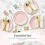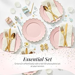 - Hosting a celebration and want disposable plates that feel polished without extra cleanup pressure? The Sparkle and Bash scalloped plate set helps hosts present food in a coordinated, stylish way while keeping events easy to manage. This bulk 50-pack of pink plates features a textured surface with an elegant gold rim that works for both casual gatherings and formal celebrations. Sized as 7.5 inch plates, they are suitable for meals, desserts, and shared party dishes. These plates are versatile across many occasions. They can be used as gender reveal plates or a complete gender reveal plates set, along with platos para baby shower niño for themed events. They also work well as girl birthday plates and party plates for girls birthday, helping maintain a consistent look for kids’ parties. Made for dependable use, they function as party dinner plates, plates for dinner party, and durable plastic dinner plates that support food without bending. Their solid build allows them to serve as sturdy disposable dinner plates and sturdy plastic plates, while the decorative finish suits fancy plates for party, elegant plates for party, and disposable decorative plates. The pink color paired with a gold rim makes these suitable as bridal plates, nice plastic plates for wedding, and elegant plastic plates disposable. They also transition into seasonal use as fancy plastic plates for thanksgiving, disposable plastic plates for thanksgiving, disposable plastic plates thanksgiving, holiday place settings, festive plates, vday plates, and platos de san valentin. Designed for convenience, these are 7.5 inch disposable plates, dinner plates disposable elegant, plastic nice plates, and disposable plates cute. Whether used as decorative plates for party, fancy plastic plates for party, or plastic plates gold rim elegant party, they help complete table settings from platos para revelacion de genero to platos de decoracion de mesas para fiestas.