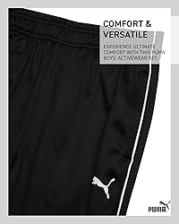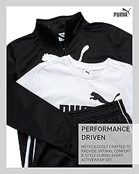 Officially Licensed PUMA: 3 Piece Boys' Activewear Set - Tricot Short Sleeve Shirt, Zip Up Sweatshirt, Active Joggers Sweatpants; Inspired by the values that make an excellent athlete: be brave, be confident, be determined, be joyful, be Puma Comfortable and Durable: Crafted from high-quality materials, this set ensures ultimate comfort and durability. The athletic shirt and zip-up jacket are soft and breathable, while the jogger pants offer flexibility and support. This makes the set perfect for active boys, providing a reliable and stylish option for their everyday adventures. Versatile Design: The PUMA Boys Pants Set features a versatile design that can be worn as a coordinated outfit or mixed and matched with other wardrobe pieces. The athletic t-shirt and zip-up jacket are great for layering, and the jogger pants provide a stylish, comfortable fit. This makes it a practical choice for various activities, from casual outings to sports. Ready for Any Adventure: Whether it's a day at school, a playdate, or a family outing, this PUMA 3 Piece Boys' Activewear Set is designed to keep your child comfortable and stylish. The combination of an athletic t-shirt, zip-up jacket, and jogger pants ensures that your little one is always ready for any adventure. This set is a practical and fashionable addition to any boy's wardrobe. Easy Care: Parents will appreciate the easy care of this PUMA set. Simply machine wash and tumble dry to keep each piece looking fresh and new. The durable fabric maintains its softness and vibrant colors after multiple washes, making it a convenient and stylish option for busy families.