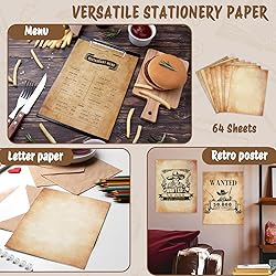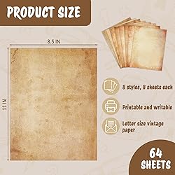 LETTER SIZE VALUE PACK - 64 sheets of 8.5 x 11 in brown vintage paper, 100gsm thickness for a sturdy feel in every print and handwritten note DOUBLE-SIDED 8 DESIGNS - Coordinated aged patterns printed on both sides so each page looks authentic for invitations, diplomas, and keepsakes INKJET LASER COMPATIBLE - Smooth printable surface supports inkjet and laser printers and helps reduce bleed-through and smudging for clean, readable text FOR INVITES CERTIFICATES RESUMES - Create formal notices, awards, certificates, diplomas, resumes, and cover letters with a classic antique look CREATIVE STATIONERY USES - Ideal for calligraphy, scrapbooking, junk journals, arts and crafts, menus, themed letters, and decorative displays