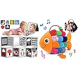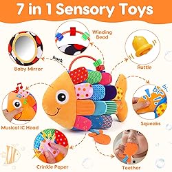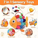 [Stimulate Visual Development] The high contrast baby book contains 11 black and white patterns and a baby-safe mirror. This helps babies develop their vision and recognize themselves from 0-3 months. At 3-6 months, babies can also use the high contrast cards for newborn with added red blocks for advanced training. For babies 6-12 months, the colorful baby contrast cards are great sensory toys for babies to work on baby's color and shape perception. [High Contrast Soft Flip Fish Toys] Our fish stuffed animal toy has high contrast patterns and soft baby mirror on the back, and each crinkly scales on the front has different colors and textures. Baby can Peek under the scales to find hidden 14 marine animals, perfect for peek-a-boo games, greatly stimulate baby's brain development. Adorable high contrast baby toys for newborn, black and white baby toys, baby rattles 0-6 months. [Multifunctional Baby Sensory Toys] The newborn girl toys can make 4 fun sounds: built-in music button, crinkle paper, "bi bi" squeaker and rattle. Our infant boy toys equipped with various accessories, can be used as animal plush toys, musical toys, mirror toys, rattle toys, and crinkle toys. Create a joyful sensory feast for your baby, they will explore all the different parts. Good baby sensory toys 3-6-12 months, sensory chew toys for babies. [Funny Baby Tummy Time Toys] The baby mirror tummy time toy is great for keeping babies entertained during tummy time, help babies practice lifting their heads, strengthen leg and arm muscles to prepare for crawling. The crinkle toys for baby with winding bead and teethers can also eases teething discomfort while boosting hand-eye coordination, grasping skills, and fine motor development. Perfect tummy time mirror toys 0-3-6 months. [Great Gifts for Baby] Our baby sensory toys are great gifts for 0-3 3-6 6-12 months growing babies. No matter what age and gender you plan to give your baby, our high contrast baby book are ideal infant toys 0-3 3-6 months, and make perfect newborn shower gifts. Great newborn toys 0 3 months brain development, baby books 0-6 months, baby learning toys.