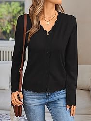 Material:Made of 71% polyester,18% Acrylic,11% Polyamide,lightweight and comfortable to wear Occasion:Our long-sleeve cardigan is perfect for a range of occasions, be it the office, work, school, parties, dates, travel, vacations, or cocktail parties It's suitable year-round, ensuring both comfort and style. Match:This knit sweater can be perfectly matched with halter tops, T-shirts, sleeveless tops, jeans, leggings, short skirts and shorts. The possibilities for your outfit are endless Stylish Design:This women's knitted cardigan features a charming and sexy wavy edge, along with delicate buttons and a V-neck design. The classic and rich solid-color design enables you to showcase your fashion sense in any occasion. This cardigan is available in multiple sizes for your choice. To ensure that you can select the right size that suits you, please refer to our size chart before purchasing to obtain accurate size information.