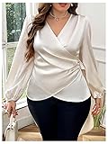 Floerns Women's Plus Size Satin Asymmetrical Wrap Tops Ruched V Neck Long Sleeve Blouses