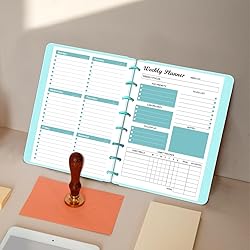 UNDATED WEEKLY PLANNER REFILL - 5.8" x 8.3" weekly planner paper refill, double side teal. You can start using it at any time without wasting a page. Whether it's 2025, 2026, or beyond, you can seamlessly continue your weekly planning journey without constraints. 53 SHEETS - Planner refills with 53 sheets/106 pages for 1 yearly, improve your productivity with this daily organizer. Easy portability for daily use at work, home, school, or during travel 8-Disc Discbound - This weekly planner refill with standar 8-Disc Discbound insert refill paper for junior size discbound planners, such as Arc, Levenger, TUL, etc MAKES YOUR LIFE PRODUCTIVE - This weekly planner refill page includes space for weekly focus, 3 top priorities,13 to do list, habit tracker, and habit tracker together for daily affairs. Track healthy habits for each week and use the checkbox as a visual reminder. This to do list planner refill con help you to save time and achieve your goals. HIGH QUALITY - Undated weekly planner refill is used to high quality 100gsm pure white premium acid-free paper, so you can confidently use most pens, pencils, and markers without ghosting and bleed-through.
