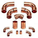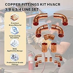 【13-Piece HVAC Copper Fittings Kit】This all-in-one copper fittings kit hvac includes 13 premium copper fitting pieces, covering key sizes for HVAC projects: 3/8" x 3/8" (2x 90 degree single street elbows, 2x 90 degree double street elbows, 2x straight coupling copper fittings); 3/4" x 3/4" (2x 90 degree single street elbows, 2x 90 degree double street elbows, 2x copper coupling hvac, 1x 45 degree elbow).Ideal as a line set copper kit for complete pipe connection needs 【High-Grade Copper for Durability】Crafted from heavy-duty copper, these hvac copper fittings and copper pipe fittings resist corrosion and wear, ensuring long-term reliability for hvac copper piping systems. As professional-grade air conditioning fittings with precise specifications, they’re a must-have for air conditioning duct sets—making them the top choice for HVAC installations 【Stylish & Professional HVAC Fittings】These hvac copper fittings blend aesthetics and practicality: featuring a sleek, burr-free finish and elegant gold-toned copper texture, they add a refined touch to any setup. With universal compatibility, they seamlessly work with a wide range of hvac copper piping systems 【Universal Fit for HVAC Systems】This copper fittings kit works seamlessly with split and central air conditioning setups, compatible with most residential and commercial HVAC-R installations.The universal hvac copper fittings integrate easily with existing copper pipe fittings, making them a go-to for pros and DIY projects 【Trusted Performance】This line set copper kit and its components. We offer hassle-free support, ensuring satisfaction for new HVAC installations or system repairs