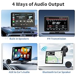 【9 Inch Large Display】The 9 inch CarPlay screen for car features a full HD touchscreen, providing clearer maps, calls, and music controls. The wide display improves visibility, making driving safer and more convenient while offering a smarter upgrade for any vehicle. 【Wireless CarPlay & Android Auto】This portable CarPlay screen supports wireless CarPlay and Android Auto, letting you easily access navigation, calls, messages, and music without cables. Enjoy hands-free control through your smartphone while staying focused on the road. 【GPS Navigation & Voice Control】The CarPlay screen offers built-in GPS navigation support and voice control compatibility. Quickly find routes, play music, and send messages with Siri or Google Assistant, ensuring smarter, safer driving without distractions. 【Mirror Link & Multiple Audio Options】The CarPlay screen supports phone mirror link plus 4 audio output modes: FM transmission, AUX, Bluetooth, and built-in speaker. This portable car play screen ensures flexible, high-quality sound in any car audio system. 【Easy Plug & Play Installation】The portable CarPlay screen connects via cigarette lighter and installs in seconds with a stable suction-cup base. No complicated wiring is required—just plug and play for a simple, reliable, and convenient car upgrade.