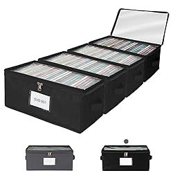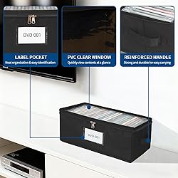 Clear Top Design: Transparent PVC lid allows you to quickly see your DVDs without unzipping, making it easy to find the movie you want Dust-Proof Protection: Secure zipper closure keeps DVDs safe from dust, dirt, and moisture, preserving discs in top condition Perfect Capacity: Holds up to 25 standard DVD cases, keeping your movie collection neat, organized, and easy to access Durable Construction: Made of premium non-woven fabric with sturdy cardboard reinforcement for long-lasting use and shape stability Space-Saving & Portable: Lightweight, stackable design with side handles for effortless carrying and efficient storage in closets or shelves