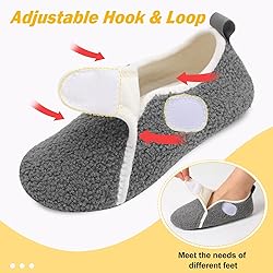 Adjustable Comfy:These womens mens slippers feature a hook and loop,meet the needs of different feets,easily to take on and off.Ideal for seniors and sensitive feet,and perfect for swollen feet,plantar fasciitis Rubber Soles:Our house slippers with soft rubber soles,providing superior traction,they deliver reliable grip on all indoor surfaces, from slick kitchen floors to chilly bathrooms,ensuring stability and comfort for indoor walking Soft Upper:Our Indoor House Shoes feature a plush upper that provides a wonderfully comfortable fit,comfortable just like socks.It is an excellent companion to relieve feets when you have been standing or walking for a long time outside Machine Wash Available.If you usually wear thick socks,it is recommended that you can choose half a size larger Household Essential:these house slippers for women men elderly,perfect for home,bedroom,office,yoga,recovery after surgery,plantar fasciitis relief,accommodating swollen or edema feet,long flights,hotel stays,or driving etc