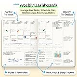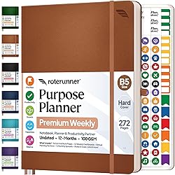 Discover Balance & Boost Productivity: 12-Month Undated B5 Weekly Planner, Manifestation Journal & Self Coaching Notebook. A unique productivity tool created with simplicity in mind, to empower busy people to take back control of their time. Planner + Notebook All in 1: Annual Calendar, Notes Index, Monthly & Weekly to do list planner dashboards, 114 numbered dotted note pages for expanded task lists, notes, or sketches. All-in-one business planner, notebook and life organizer. 6 sheets offering 500+ productivity stickers included to brighten & lift your planning game! Smash Your Goals & Prioritize Wellness: 5 Roles & Goals templates for purposeful goal setting. Reading, Bucket lists, & Self Care journal. AM/PM Routines, habit and health tracker, nutrition & fitness included. Perfect planners 2026 for women and men. Satisfying Writing: High performance planner with stitch-bound lay-flat pages. Sturdy PU leather hard & softcover options with elastic pen loop. 100GSM no-bleed, no-smudge wood-free paper. 3 ribbon bookmarks, elastic closure, back pocket and smoothly rounded edges all packaged in a hard-shell box to protect your planner. Voted Best Time-Management Planner: NY Magazine Strategist's Best Time-Management Weekly Planner 5 years and counting. ADHD planner for adults created by an ADHD sufferer to reduce the overwhelm and rediscover purpose. 7 years and 100,000+ lives impacted!