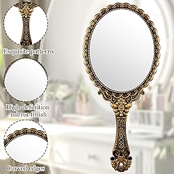 Package Contents: This set contains 1 handheld makeup mirror. This handheld makeup mirror has a retro and elegant color and is easy to use. You can choose according to your needs to bring you a good experience Portable Design: This retro handheld makeup mirror has a strong sense of design and unique design. This makeup mirror has an independent handle, which is convenient for women to put on makeup and travel with High-Quality Material: This handheld makeup mirror is made of high-quality plastic material, which is safe and environmentally friendly, lightweight and easy to carry. This exquisite handheld mirror has a clear mirror surface and is easy to use Exquisite Gift: This handheld makeup mirror is exquisitely made and elegant in style. Giving it to female friends as a gift will help enhance their charm, better help them put on makeup, and make them happier Wide Range of Uses: This portable handheld mirror is not only suitable for women to put on makeup and travel, but also suitable for makeup artists and hairdressers to wear when putting on makeup and cutting hair for customers