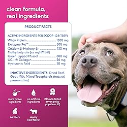 RESTORING MOBILITY FOR SENIOR DOGS WITH ARTHRITIS – UsedFor easing dog arthritis pain relief in aging pets, large breeds, and dogs recovering from injury. This dog joint supplement addresses the root cause of stiffness: degraded cartilage and inflammation. OUTPERFORMS GLUCOSAMINE CHONDROITIN FOR DOGS – CapableOf rebuilding joints with UC-II collagen, HMB for muscle preservation, and hyaluronic acid for lubrication. This hip and joint supplement dogs formula surpasses traditional glucosamine for dogs. USED FOR DOGS STRUGGLING WITH DAILY MOVEMENT – Perfect for senior dog supplements needs when climbing stairs, jumping in cars, or long walks becomes difficult. This dog pain relief anti inflammatory formula supports comfortable mobility during activities. ADVANCED HIP AND JOINT SUPPLEMENT DOGS TRUST MOST – HMB preserves muscle mass protecting joints under stress. UC-II Collagen supports cartilage regeneration for dogs of all sizes, ages, and activity levels. POWDER BEATS TRADITIONAL HIP AND JOINT CHEWS FOR DOGS – This dog joint supplement powder mixes seamlessly with food for better absorption than hard chews. Ensures consistent dosing of this pet supplements formula for optimal joint pain relief for dogs. VET-FORMULATED DOG JOINT AND HIP SUPPLEMENT – Developed by veterinarians as a complete bone and joint supplement for dogs. Supports cartilage, muscles, and connective tissue while promoting dog arthritis supplement benefits backed by clinical research. PREMIUM DOG HEALTH SUPPLEMENTS MADE IN USA – Proudly crafted as a dog pain relief medication alternative with no fillers or artificial ingredients. Trusted dog supplements & vitamins for long-term joint health and mobility support. ADDRESSING WHY JOINT DETERIORATION OCCURS – Age, weight, and overuse cause cartilage breakdown in dog joints. This dog supplements for joint and arthritis formula targets these triggers with clinically studied ingredients for comprehensive joint health. CAPABLE OF NATURAL DOG PAIN RELIEF – Green Lipped Mussel in this arthritis relief for dogs supplement promotes healthy inflammatory response, helping reduce occasional soreness and stiffness naturally. Works as effective dog anti inflammatory support. COMPLETE HIP & JOINT SUPPLEMENTS FOR DOGS CARE – Unlike basic glucosamine chews for dogs, this dog hip and joint formula combines five proven ingredients delivering joint support for dogs, muscle protection, and cartilage regeneration in one powder. Please Note: Packaging may vary due to design changes. Contents remain unchanged in quality and ingredients.
