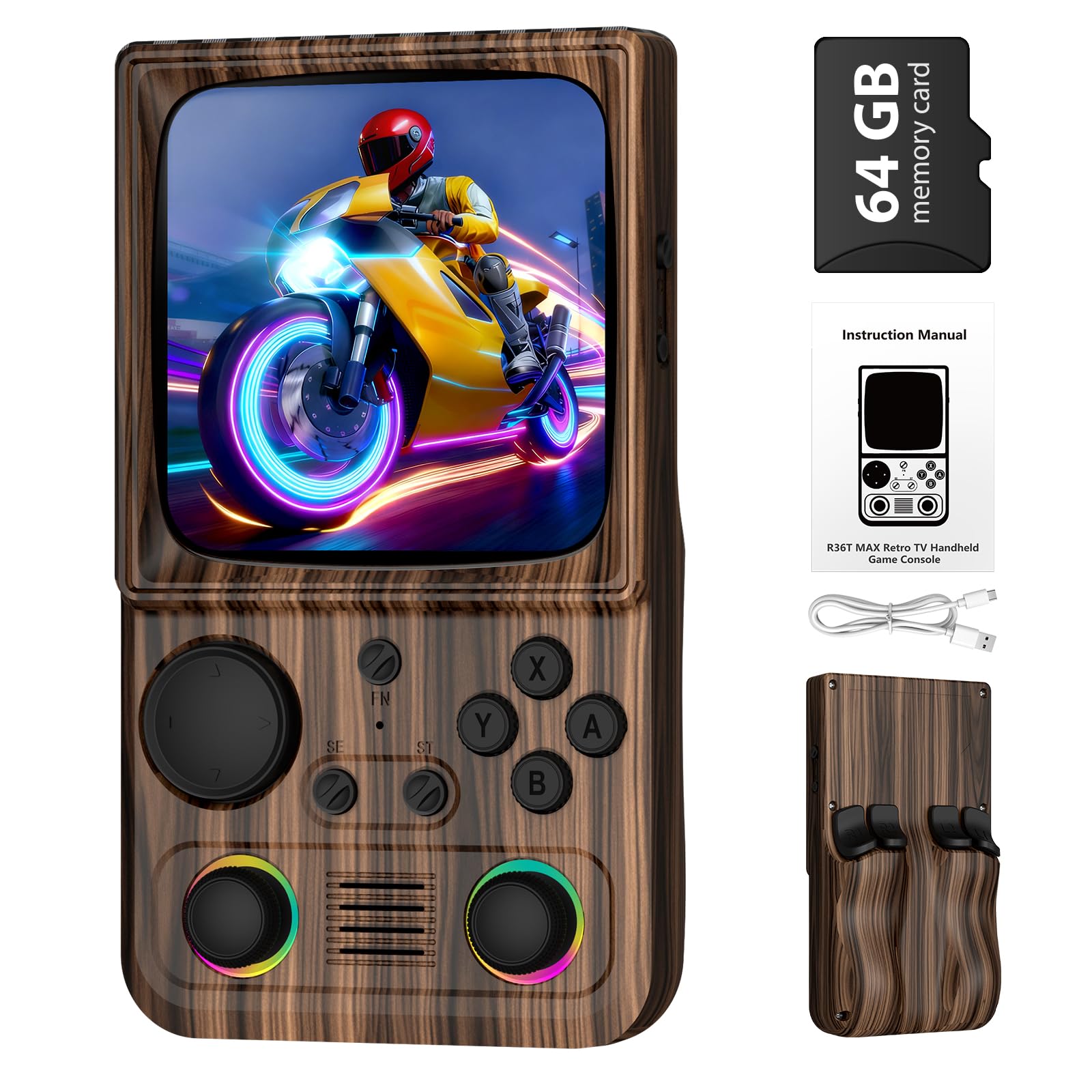 - Step back in time with the R36T MAX—a retro-style handheld console that blends classic gaming charm with modern connectivity and performance. Vast Game Library Ready to Play Powered by the popular EmuELEC entertainment system, the R36T MAX supports a wide range of classic game emulators. The included 64GB storage comes preloaded with a curated selection of timeless games from various eras, so you can start playing immediately—no complicated setup required. Share the Fun with Multiplayer Modes Go beyond solo play with built-in online multiplayer support over 5G WiFi. Gameplay or compete with friends using compatible wireless controllers (sold separately). Perfect for gatherings, family nights, or connecting with players online. Authentic Retro Visual Experience Enjoy crisp, vibrant graphics on a 4.0-inch IPS full-view screen with 720 x 720 resolution. The OCA full-lamination technology reduces glare, while the classic TV-inspired bezel design adds a nostalgic touch, faithfully recreating the look of vintage gaming displays. Comfortable Controls with Customizable RGB Lighting The responsive joystick ensures precise control in every game. Personalize your console with multi-color RGB lighting around the joystick—choose from 16 dynamic modes or turn it off for a clean look. All-Day Battery & Travel-Friendly Design With a large 4000mAh battery, enjoy up to 10 hours of continuous gameplay. The compact body fits comfortably in your hands and comes with a protective carry case. Use the built-in speakers or plug in headphones via the 3.5mm jack for private listening—great for commutes, trips, or relaxing at home. What’s Included: R36T MAX Handheld Console 64GB TF Card (Preloaded with Games) USB-C Charging Cable Protective Carry Case User Manual