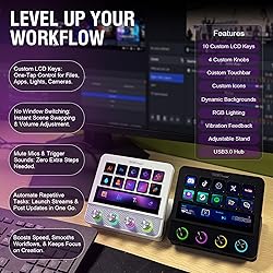 One-Touch Macro Execution & Unlimited Layout Customization: Launch system commands, web actions, apps, files/folders, text input & GIFs instantly - eliminate repetitive tasks with a single press. GIF-supported icons, unrestricted scene pages, 10 LCD keys, 4 knobs (with touch displays) & editable TouchBar per scene. Custom Hotkeys & Multi-Step Workflows: Execute chained operations (e.g., stream setup, video editing shortcuts) in one tap; no coding required. 500+ Plugin Ecosystem: Seamlessly integrate with OBS, Discord, Spotify, plus utilities (clock, weather, calendar, stopwatch) for all productivity needs. RGB-Knobs with Dynamic Visuals: Customize knob RGB colors; sync dynamic backgrounds & audio-reactive visuals for immersive desktop ambiance. Premium Build & Utility: Carbon-fiber-like overlay, toggleable key haptics, 2× USB 3.0 + 1× USB-C non-powered hub - blend style with practicality. Ergonomic Stand & Cross-Platform Support: Adjustable stand for optimal viewing; plug-and-play with Windows 10+ & macOS 11.0+ via USB-C.