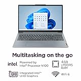 Harness smart power and multitasking on the go with the Intel Processor N100 and LPDDR5 4 GB RAM, enhanced by the adaptive performance of Smart Power. Store your entire multimedia and show library with 128 GB SSD storage and 128GB External. Up to 10% slimmer than the last generation. Available in Arctic Grey this sturdy build is military-grade quality, withstanding shocks, dust, and extremes of travel in more hostile conditions. 88% AAR on the IdeaPad Slim 3i’s FHD LCD display, which comes with a taller 16:10 aspect ratio on the 16". Keep your eyes safe from strain with a TÜV-certified low blue ight display and listen to immerse Dolby audio out of user-facing speakers. Enhance and accelerate your study and work experience with full-function Type-C ports for faster power delivery, display output, and data transfer, larger touchpad, and 720P camera with privacy shutter. Go farther and for longer with a larger battery and Rapid Charge Boost, with gives you two hours of use on a 15-minute charge. Includes One-year Microsoft 365 subscription