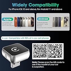 【Wide Compatibility】This wireless adapter designed for seamless integration and works with most factory-wired CarPlay systems. It supports iPhones from iOS 10+ and Android devices from version 11+. The package includes a USB-C adapter to ensure compatibility with both classic USB and modern USB-C car ports. Please note: this product requires a vehicle with pre-installed CarPlay or Android Auto functionality; Please noted your original car system must supports wired CarPlay and it can't support YouTube. 【Enhanced Performance】 This wireless CarPlay adapter with Featuring an advanced smart chip, it effortlessly transforms your factory-wired CarPlay into a wireless system. And ensures flawless connectivity for navigation, music playback, Siri voice commands, and hands-free calls. Elevate your daily drive with instant, cable-free convenience. (remind: Please check your car supports wired CarPlay before purchase) 【Plug and Play】 It is easy to plug in the adapter and pair your device in your car. No app installation or downloads are required. Each time the vehicle is started,the adapter automatically reconnects instantly, ensuring a hassle-free initial setup and a durable, seamless connection. Please check if the wireless adapter is plugged in stable when you used it. 【Smart Cooling System】Engineered with an advanced thermal management system, this wireless adapter maintains optimal temperature to prevent overheating. Enjoy consistently stable performance and uninterrupted connectivity, even during extended drives under demanding conditions. 【2-in-1 Wireless CarPlay Adapter】Upgrade from wired to wireless carplay adapter in seconds — seamlessly convert your factory CarPlay or Android Auto system without cables. Featuring a revolutionary ultra-slim design that's 50% smaller than conventional adapters. It will convenient to take when will you need. Kind reminder: please check the image to confirm if your vehicle model is compatible with this product.