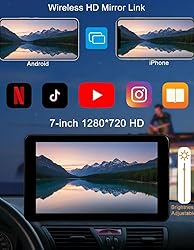【Wireless CarPlay & Android Auto】 Connect your phone wirelessly through Bluetooth and WiFi. Access calls, messages, navigation apps, and music services with voice control for hands-free and safer driving. 【7" HD Touch Display & Flexible Audio Output】 Features a 1280×720 full-color touch panel for clearer visuals and smoother operation. Comes with built-in speakers, and supports audio output via Bluetooth, FM transmission or AUX-in to integrate with your existing car stereo. 【Smart GPS Navigation via CarPlay/Android Auto】 Use your favorite navigation apps with real-time traffic information, lane prompts, and intelligent routing. Fully supports voice assistant commands so you can navigate without touching the screen. 【 Mirror Link 】 Supports screen mirroring for both iOS and Android devices. Cast videos, apps, sports games, or entertainment content onto the 7-inch display. Upgraded chip ensures smoother connection and faster response. 【Universal for All 12–24V Vehicles】 Works with almost any car, SUV, truck, RV, or pickup. Easy to set up without wiring or professional tools. Includes both a dashboard bracket and a suction cup mount for flexible placement.