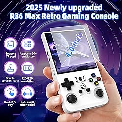 Newly Upgraded R36 Max Handheld Game Console: The retro handheld game console features 1.5GHz 64-bit RK3326 CPU. In addition, our retro gaming console adopts the Linux game system with good stability, it can easily run large 2D and even some 3D games, providing services stably for a long time, reduces the probability of game crashes and ensures the smooth progress of games. Greatly enhancing players the gaming experience under different emulators 4.0 Inch IPS Screen: This Mini Retro Game Console With 4.0-inch IPS Screen 720*720 high resolution makes your game console screen details more vivid. Meanwhile, R36 Max 2025 equipped with dual joysticks and full key layout, built-in speakers and a 3.5mm headphone jack for a more immersive gaming experience Diverse Game Genres: This R36s handheld game console comes pre-loaded with thousands of games. With its 64GB storage capacity, you can enjoy a vast library of games, and there's an option to insert an additional TF card to expand your game collection even further Portability Design with 4000mAh Battery: This retro gaming console is compact and lightweight. With 4000mAh large-capacity rechargeable battery provides up to 6 hours of battery life, allowing players to enjoy gaming anywhere, anytime. Brings lots of joy and happiness to you during a trip or a long journey Extended Multi-Functions:AQHH retro gaming console handheld boasts an ergonomic design, making it comfortable to hold and operate for extended periods. It comes with a Portable Case, type C charging cable, user manual, and a screen protector, providing all the essentials for a seamless gaming experience. Video game console's sleek and stylish exterior, available in multiple colors, adds to its overall appeal