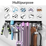 Strong & Multi-Purpose Storage: Heavy-duty wall mounted gym storage rack designed to hold common workout accessories such as resistance bands, lifting belts, jump ropes, foam rollers, chains, and cable attachments in one organized place. Quick and Easy Installation: Includes mounting hardware and clear instructions for fast installation on suitable wall surfaces, allowing you to set up your home gym storage efficiently. Suitable for Various Wall Surfaces: Designed for wall mounting on common wall types when installed correctly, offering flexible placement options for home gym setups. Maximize Space and Reduce Clutter: Wall-mounted design helps free up floor space by storing bulky gym accessories vertically, keeping your workout area clean and organized. Designed for Gym Accessories: Multiple hooks provide dedicated hanging space for different fitness items, helping prevent tangling and making equipment easy to access during workouts.