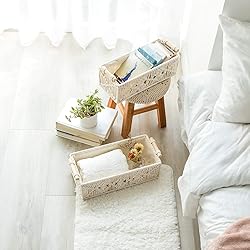 PERFECT ADDITION TO BATHROOM DECOR. These cute little baskets evoke a warm and classy taste that both works harmoniously and aesthetically. The neutral colors and sleek design means that it will fit perfectly into any home. Use it to decorate, organize and store items, keep the home clean and comfortable. --( It is protected by intellectual property right.) MULTIPLE-USE STORAGE BINS. These baskets for organizing help keep everyday necessities like toilet paper rolls, towels, cosmetics, accessories on the dresser, baby toys, diaper and other small sundries. Great for using in the bathroom, bedroom, nursery, bedroom, living room, guest room, kitchen, office etc. Keep the space organized and within easy reach THOUGHTFUL GIFT: Used this as a gift basket of holiday present and filled it with several bath time related gifts like candles, salts, bath bombs, oils, and tubes of lotions for your friends or family DISTINCTIVE CRAFT: This basket is attractive, soft and sturdy. Hand-woven cotton with wire frame to keep its even and shape. Sturdy handle for easy movement and decoration. The linning design prevents the batting jute material from sticking to the object, cleaner and safer Size: The size of the two small baskets is different. The bigger is 13.5’’L x 6.5’’W x 4’’H and the smaller is 12’’L x 5.5’’W x 4’’H. Two different capacity of baskets satisfy your storage needs, suitable for a variety of small items classification.