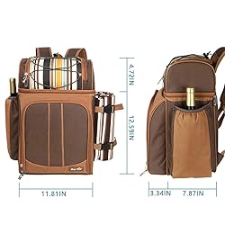 LARGE INSULATED COOLER COMPARTMENTS: This picnic basket for 2 person owns 3 COOLER compartments - Biggest central compartment size holds around 10L, perfectly to be a leak proof backpack cooler storing drinks with ice pack. Top pocket size hold around 3.5L, not 100% leakproof, better for storing dry foods . Side wine holder is good for a large bottle. This is an impressed large picnic backpack good for any party or concert. ERGONOMICS & COMFORTABLE PICNIC BACKPACK SERVICE 2 : For any large size picnic backpack for 2, wearing on back should be comfortable. Try this one! Ergonomic design make you feel it easy when you carry heavy load with picnic set for long trip,hiking,and camping . Absolutely proudly to be wedding presents baskets for young couples! SUPERIOR QUALITY PICNIC BASKET : Made of strong polyester fabric with back waterproof PU coating, non-fraying stitching, heavy duty zippers,this nice backpack picnic basket will last for years. The wine glass, plate, and chopping board made of plastic are lightweight,strong, and not easy to break comparing with glass or porcelain,especially good for outdoor use. PREMIUM PICNIC SET SUPPLIES FOR 2: Cutlery set includes 2×(stainless steel knives, forks, spoons, dinner plates, cotton napkins, wine glasses ) & 1×cheesetter knife & 1×bottle opener & 2×Salt/pepper shakers & 1×plastic chopping board, + Water resistant fleece blanket. THE PERFECT WEDDING GIFT - Out of the ordinary gift ,no matter the occasion; the perfect gifts for couples who have everything, Valentines Day Gift, bridal shower gifts for bride, wedding gifts for couples, engagement gifts for her, Christmas gifts for couples, wedding shower gifts and anniversary.