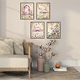 Locomiss Pink Fairy Enchanted Forest Mushroom Wall Art Decor, Fantastic Cottagecore Floral Mushroom Fairy Garden Cabin Pink and Green Prints Posters for Girls Room Wall Decor, Set of 4 (8x10 Unframed)
